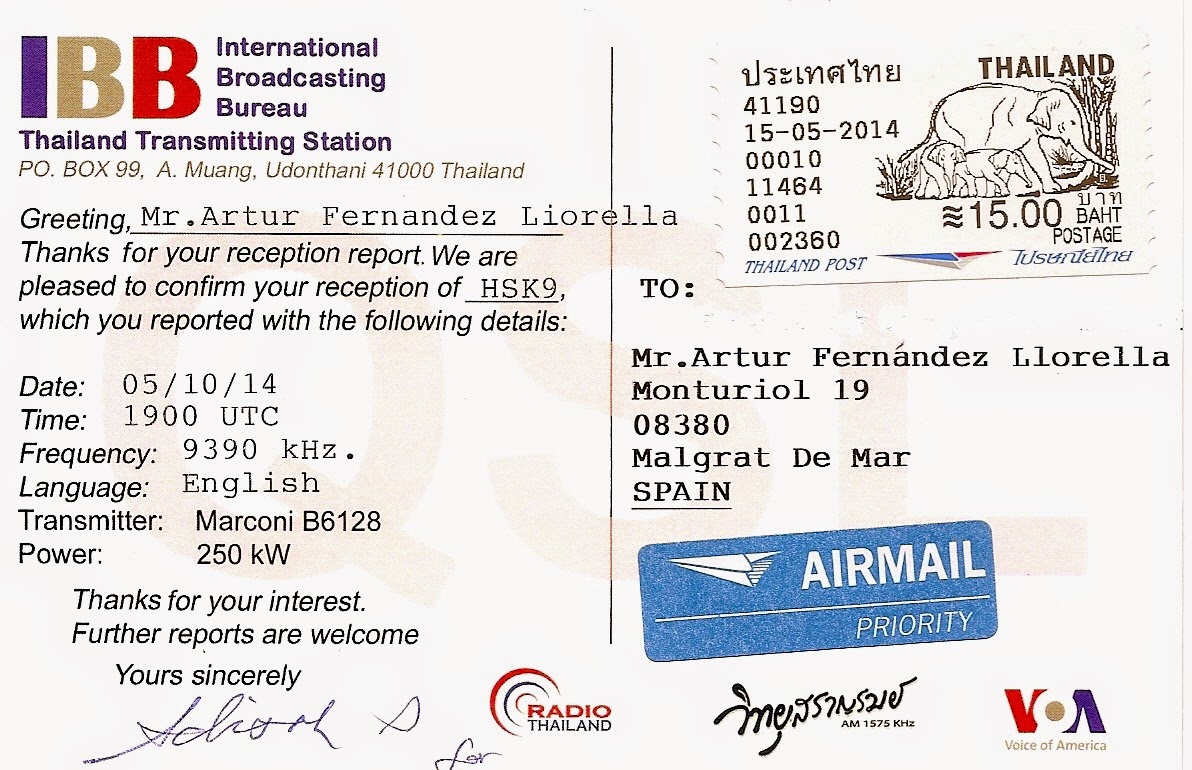 Radio Thailand (HSK9), 9390 KHz, servei exterior de la ràdio nacional tailandesa. Rebuda QSL per informe enviat a manager_thailand@tha.ibb.gov